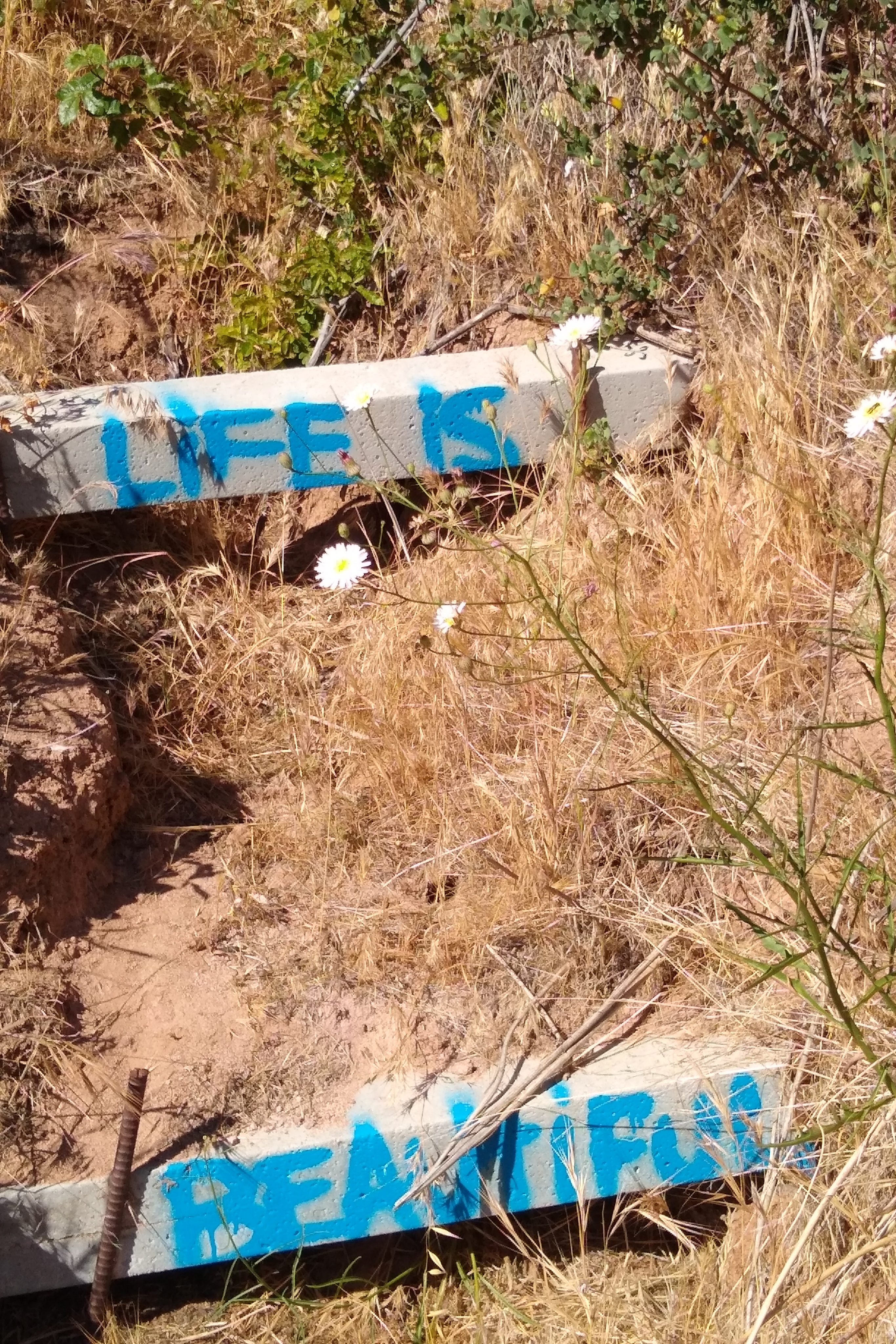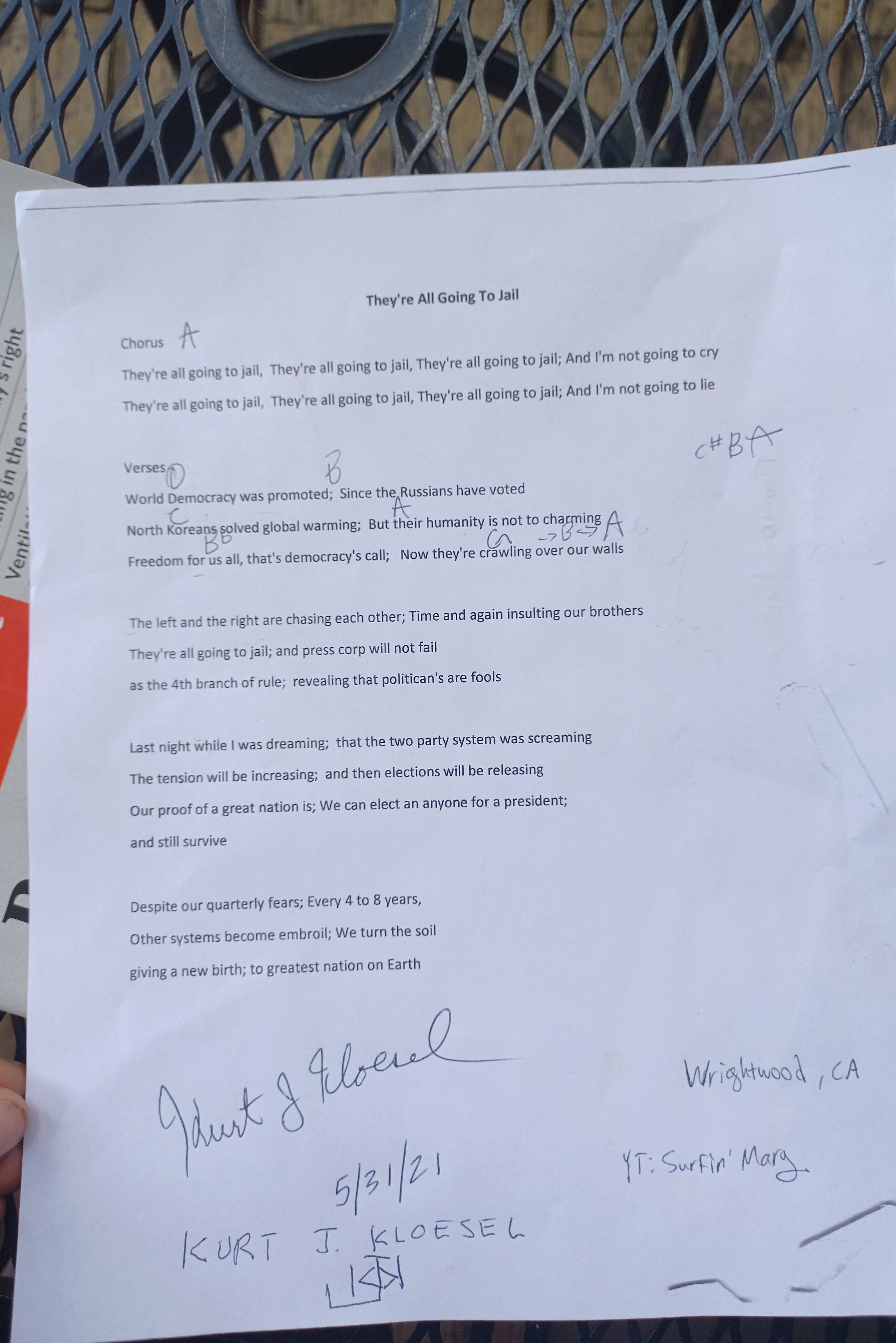 Monday, May 31st: Got to Wrightwood just in time for their Memorial Day celebration–we’d been wondering about all the red, white and blue t-shirts. Heard a liquid, soulful, live trumpet rendition of Taps. Had sandwiches at the “Village Grind”, where we met aerospace engineer Kurt playing guitar on the deck. Astounding–we have met extraordinary people on this hike! Freddy got to to talk about non-binary politics, rank voting and we were treated to a table side performance of Kurt’s original tunes, including this one–see below–and another based on Thomas Merton’s “Seeds of Contemplation”.