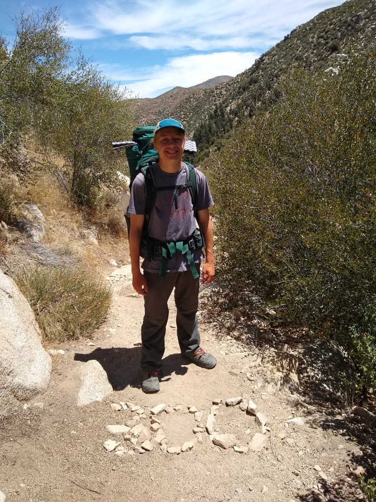 Sunday, May 30th: Hiked to Fountainhead Spring–about seven miles–and refilled with water. Beautiful little shady spring. More poodle dog bush. Nice winding trail among the Ponderosas, then long, hot, exposed descent to the Mill Creek Fire Station. Other hikers cooled down right outside the fire station (water, shade, electrical outlets) but we stayed in the shade of a tiny Ponderosa near Chris’ truck in close proximity to our snacks (chocolate, Cheez-its). We were a little at loose ends–didn’t want to hike forward outside of road access because we were due in Wrightwood the next evening. Stayed at a NF campground ($6/night!) and enjoyed shade, a picnic table and proximity to regular, non-hiker Californians. Finally, finally got my little half size fiddle from its hiding place in the truck and played tunes for a couple hours. Paradise! Played poker using Cheez-its as chips. What a relaxing evening!