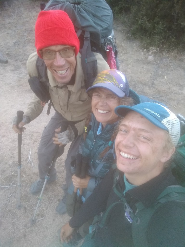Monday, May 24th: Hiked extra distance to Holcomb Creek–felt very solitary outside our previous bubble. We had a huge campsite all to ourselves by a swimming hole (waist deep) with a little water fall. Prior to Holcomb Creek we went up and down several shallow ridges and through a deserted horse camp featuring–of all things–a solar powered, handicapped accessible composting toilet. Found water at the horse camp hidden away in some willows–just a small trickle rapidly disappearing into the sand.