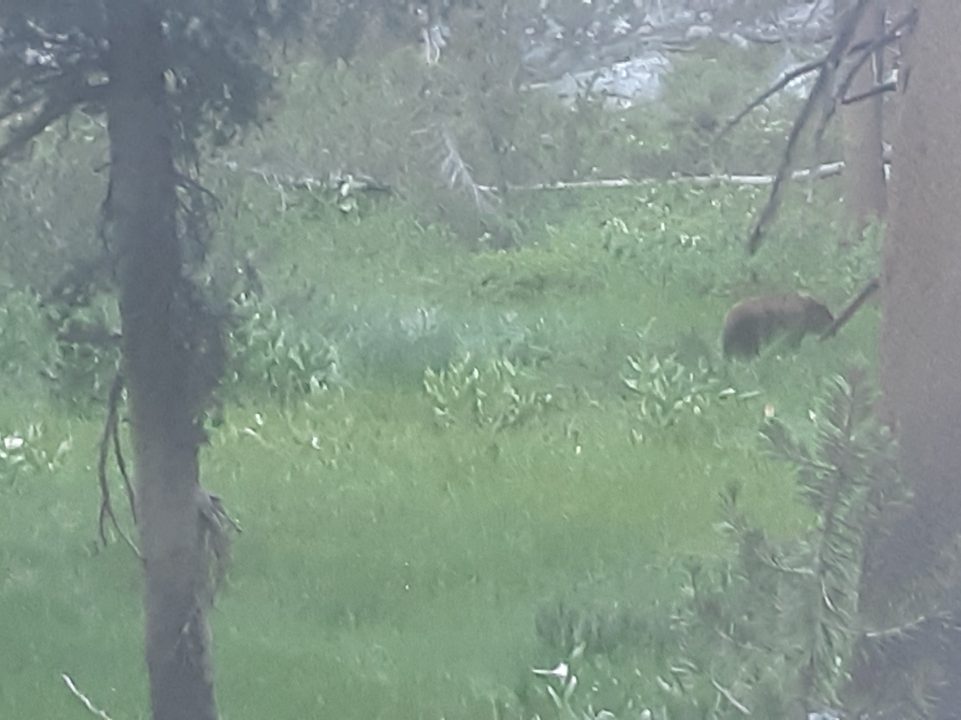 Got up early to beat the storms on the next pass and were surprised to see a bear nosing around for roots in the wet meadow as we started off! It ignored us as we slipped by–Cat singing a rousing few verses of “The Girl I Left Behind Me”, not necessarily in tune and somewhat breathlessly.