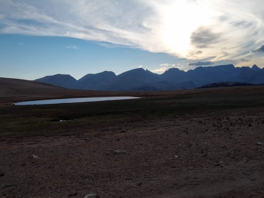 Had a nice talk with sibling hikers Brooks and Gabby just after the pass. The pass itself was fine. Legs were fine. The impending thunder storm as we came down under the other side was not fine. We called it quits with the rain a little early and set up camp shortly before Vidette Meadows.