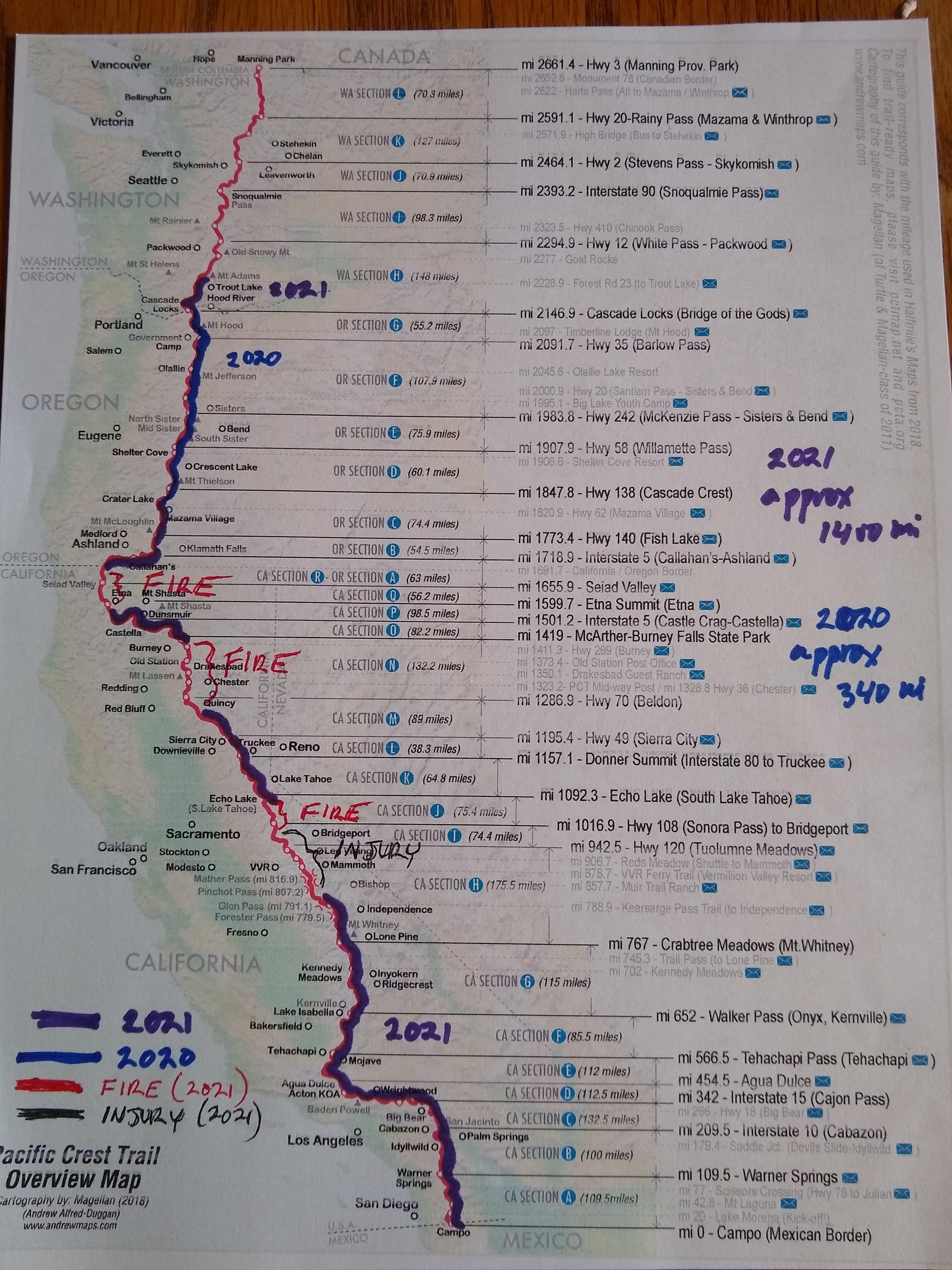 From April 29th to Sept. 2nd, 2021 the PCT was once again our fall-back plan (the original plan for a sabbatical in the UK having been high jacked by, yep, COVID) and we hiked most of California (from Campo, at the Mexican border) to the Oregon border, then from the Oregon border to Crater Lake, then from the Washington border to Trout Lake/Forest Road 23.